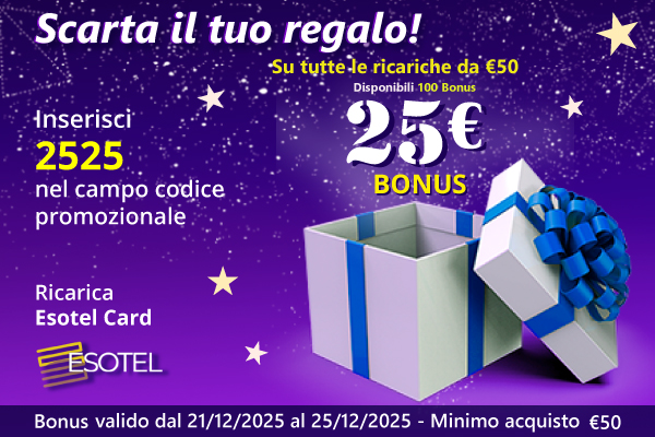 Codice bonus di 25€ se ricarichi 50€ - Bonus valido su tutte le ricariche dal 21/12/2025 al 25/12/2025 - Disponibili 100 BONUS fino ad esaurimento